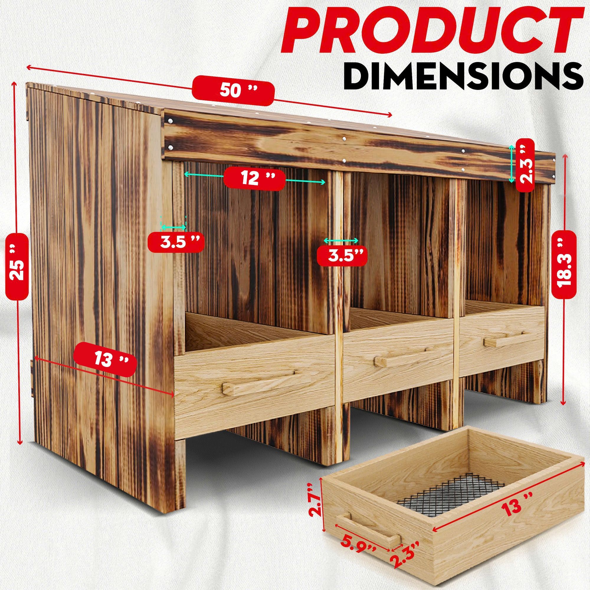 Acest coop de pui robust este construit pentru durabilitate și rezistență la intemperii. Este construit din lemn de brad solid cu panouri de 1,5 cm grosime, oferind un cadru robust. Dimensiunile exterioare ale Coop sunt de 127 × 33.02 × 63.58cm (lungime × lățime × înălțime), oferind un interior spațios, menținând în același timp o amprentă compactă potrivită pentru utilizarea curții.