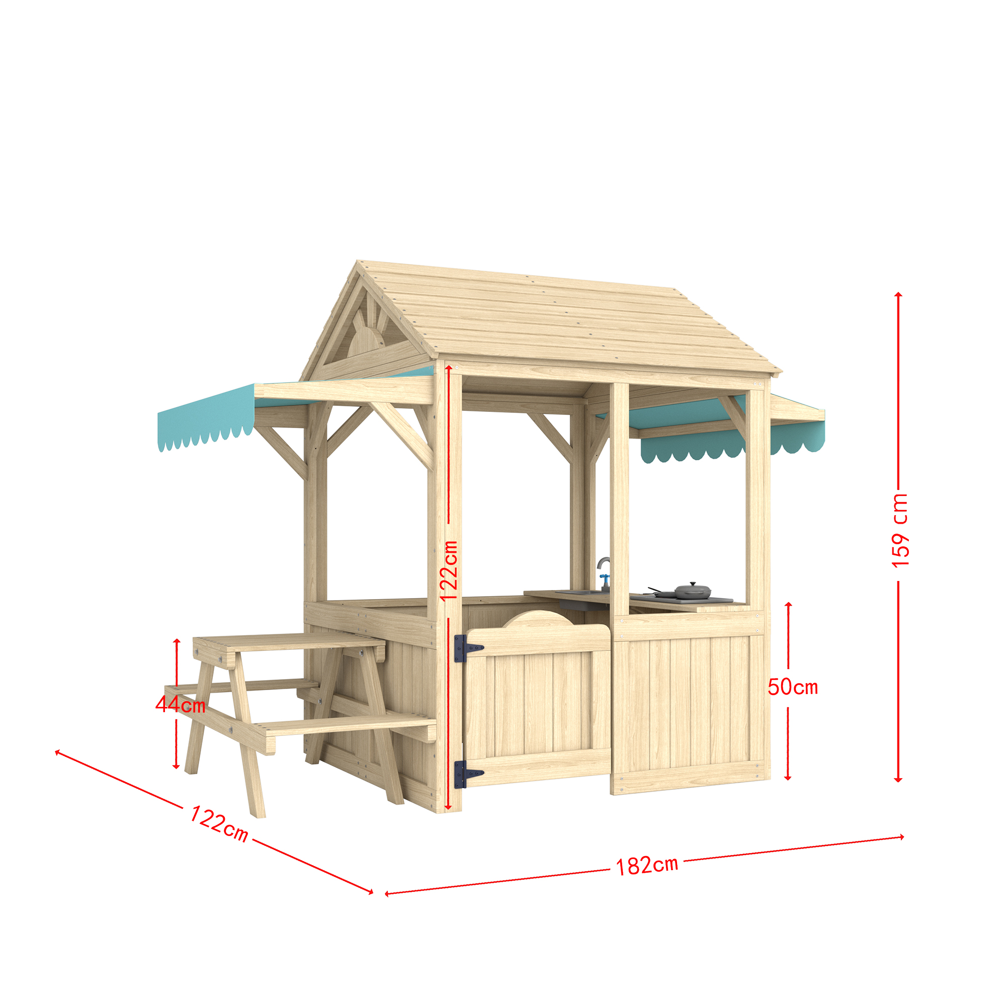 Această casă de joacă din lemn pentru copii pe Wideway este concepută din lemn de brad premium, asigurând eco-prietenie, forță și durabilitate. Măsurând 182 × 122 × 159cm, structura oferă un spațiu suficient pentru jocul imaginativ, garantând în același timp siguranță. Playhouse prezintă o bancă de lucru cu o chiuvetă mică, împreună cu o masă laterală și o bancă, perfectă pentru jocuri de rol și activități de grup. Acoperișul înclinat cu nuanțe de țesătură colorate adaugă atât farmec, cât și funcționalitate, ceea ce îl face potrivit pentru uz în aer liber. Fiecare detaliu este lustruit cu atenție pentru margini netede, protejând copiii în timpul jocului. Ideal pentru curți sau grădinițe, această casă de joacă creează un mediu distractiv și sigur. Cu ani de expertiză în produsele pentru copii în aer liber, Wideway asigură o calitate fiabilă de încredere de clienții din întreaga lume.